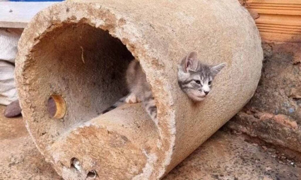 Gato resgatado com cabeça presa em buraco de manilha